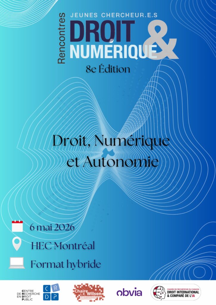 La Chaire L.R. Wilson a le plaisir de vous convier à la 8e édition des Rencontres Jeunes Chercheurs Droit & Numérique, qui se tiendra le mercredi 6 mai 2026 en format hybride à HEC Montréal. Cet événement s’adresse aux jeunes chercheuses et chercheurs souhaitant échanger autour des enjeux contemporains du droit du numérique, dans un cadre favorisant la discussion et les collaborations.